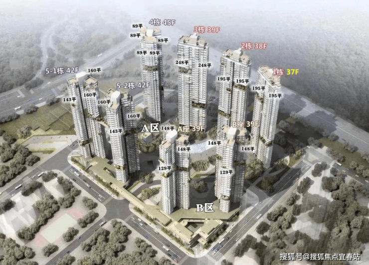 1栋A座:148米,46层,共85户,朝南为主,三梯两户,约266-321平,427平(顶复)