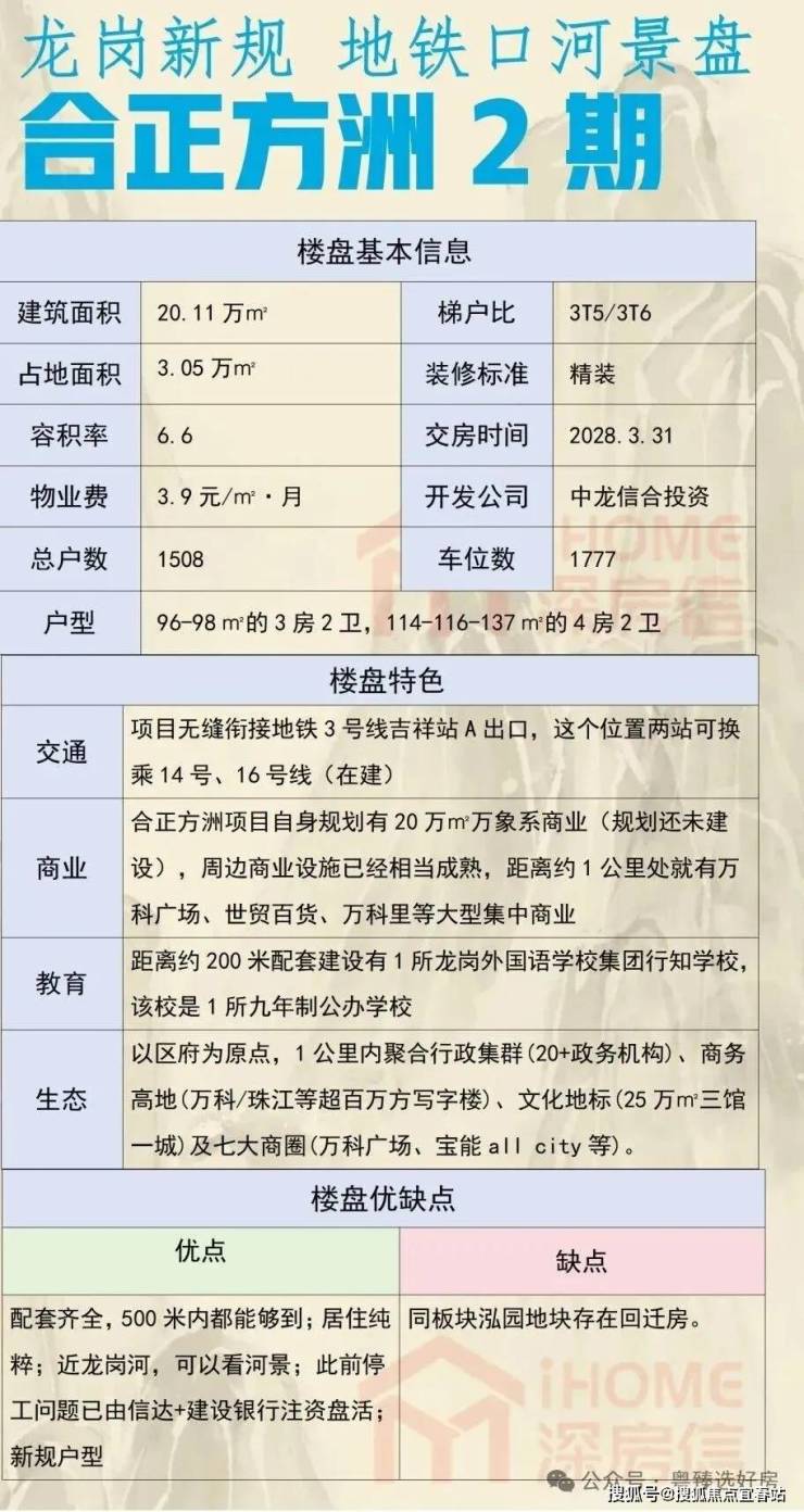 本次为合正方洲多期项目中最佳一期,沿龙岗河而建,享河景公园景观,视野开阔;停车位充足(户位比1:1.18);新规户型,得房率较高(不加赠送78%,加上赠送约92%-95%)。