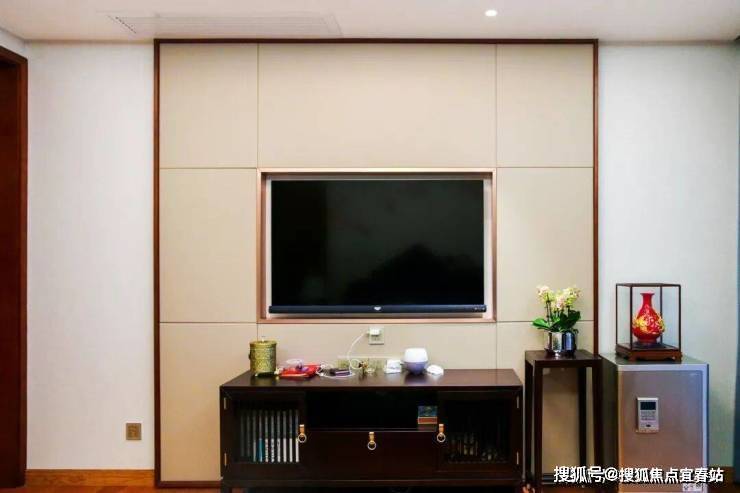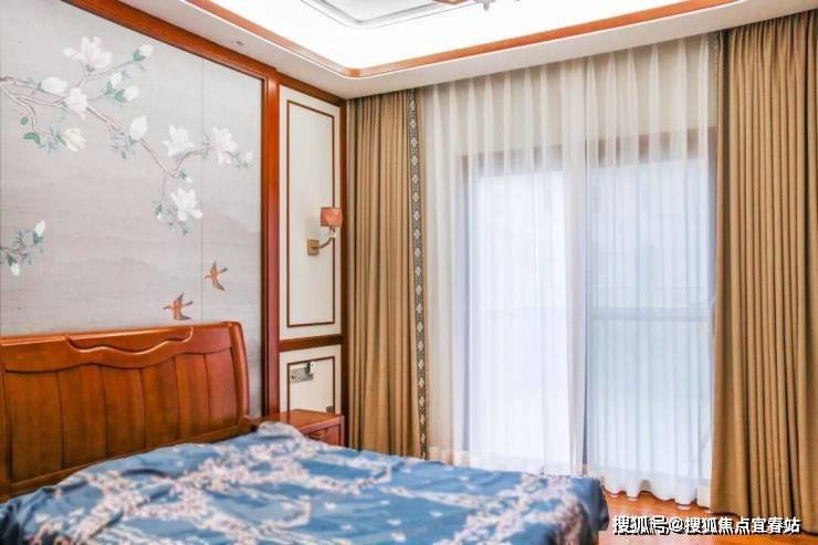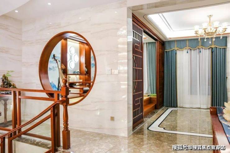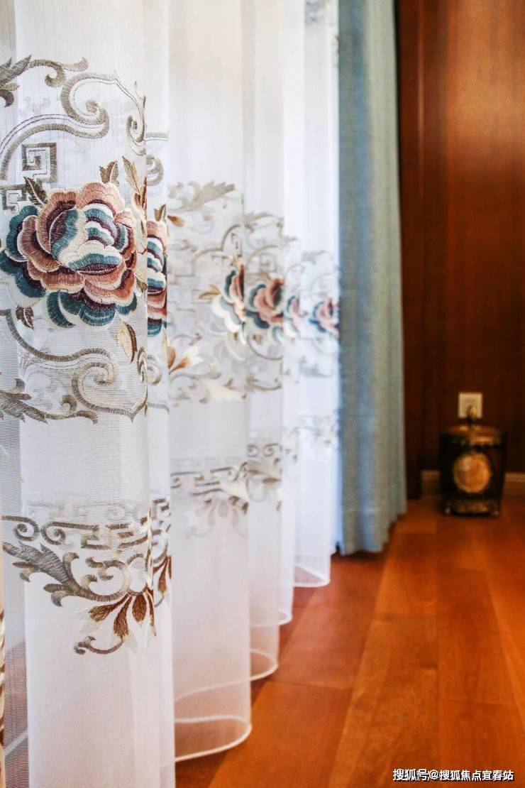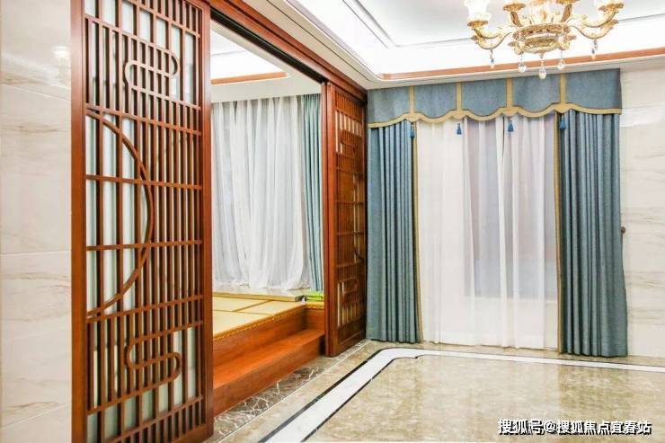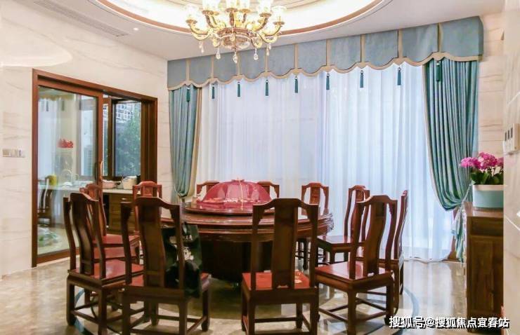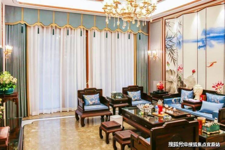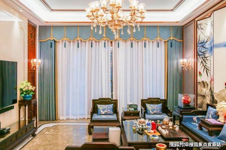 湖蓝色窗帘烘托出休闲厅深邃的大气之感,体现自由的生活理念。米黄色的背景墙采用双宫丝的材质,自然的纹理展现了中式典雅的韵味。放眼望去,休闲厅虽没有名贵之物,却给人古典尊贵之感。