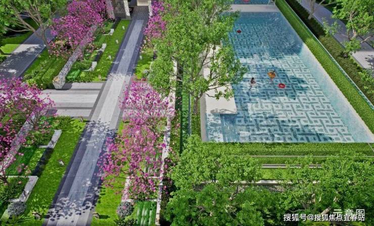度假风情式的灵动泳池,消弭与天地的界限天光云影跌入碧波,岸边花树晕开整片画卷的“镜花水月
