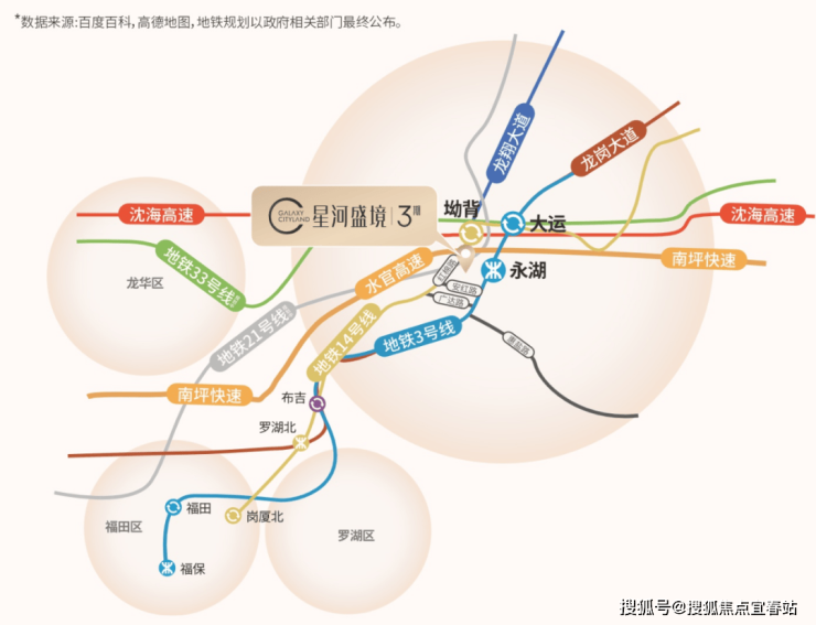 项目靠近地铁3号线永湖站,直线距离一公里范围内还有地铁14号线坳背站,这也是未来地铁21号线的换乘站。