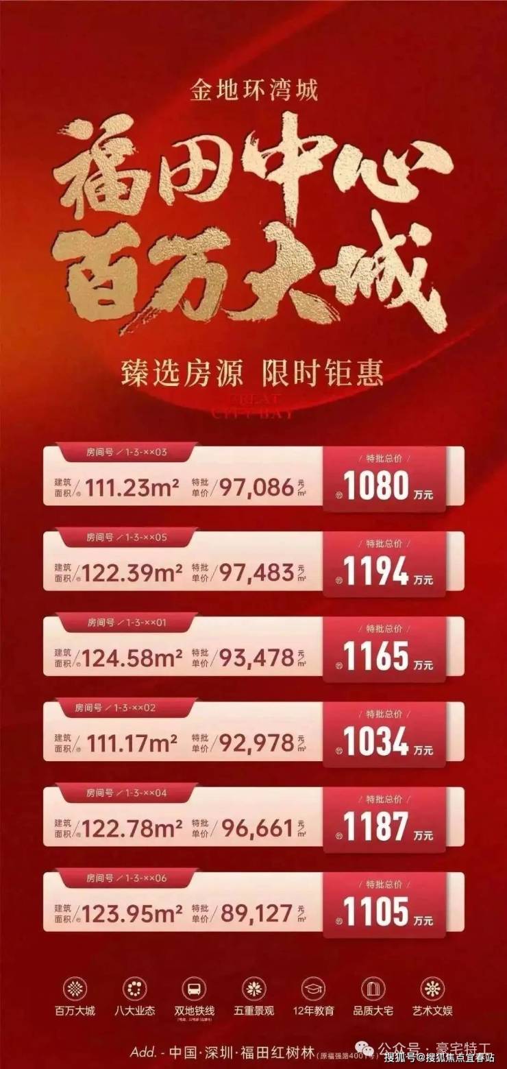 【八大业态】高端住宅·公寓·商业·办公·文化·学校·公园·顶奢酒店【占地面积】约9.6万㎡【建筑面积】103万㎡【绿化率】23%【产权年限】70年【房产性质】住宅【总户数】约850户(03地块)(首推二、三单元,共401套)【推售产品】约125-270㎡【总层高】53层、60层【使用率】77%【梯户比】4梯3户、4梯6户【均价】约10万【交付标准】精装【交房时间】2025年底【车位比】1:1.3【开发商】金地集团/福田建设集团【物业公司】金地物业
