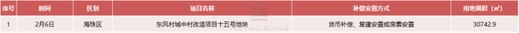 本周,广州市共发布4个项目动态:实施方案调整公示1项,用地面积14.6万㎡;控制性详细规划调整1项,用地面积0.7万㎡;征收补偿安置方案公告1项,用地面积3.1万㎡;土地征收公告1项,用地面积3.5万㎡。
