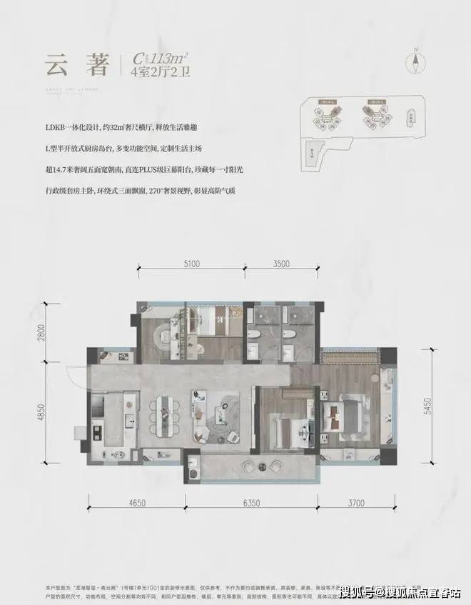 113㎡的4房2厅2卫,设计的是横厅格局,带1个6.35米长的大阳台,南北通透户型,朝14.7米南向五面宽,主卧独创三面飘窗。