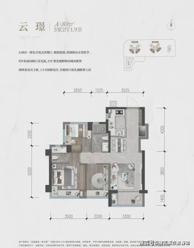 80㎡的3房2厅1.9卫,设计的是竖厅格局,客厅开间3.3米,S墙设计预留冰箱位,U型厨房,分别为西南及东南朝向。
