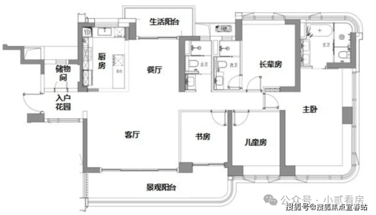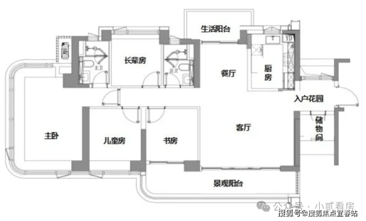 143㎡四房两卫:空间更加阔绰,生活阳台与景观阳台相呼应,增加了空间的通透感。主卧套房设计,配备独立卫生间和储物间,保障主人的私密性和舒适性。