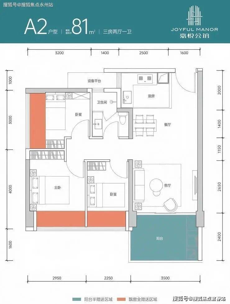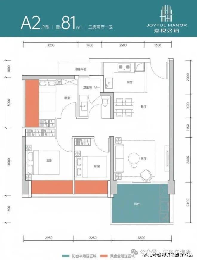 81㎡的3房2厅1卫,设计的是经典竖厅格局,客厅3.5米开间,LDKB一体化设计,三开间朝南,动静分区,3个卧室分别做到了主卧11.29㎡/次卧8.97㎡/次卧7.76㎡(包含墙体飘窗),客厅出8.4㎡的大阳台,U型厨房5平,卫生间干湿分离,得房率约86-90%(包含赠送),正南朝向。