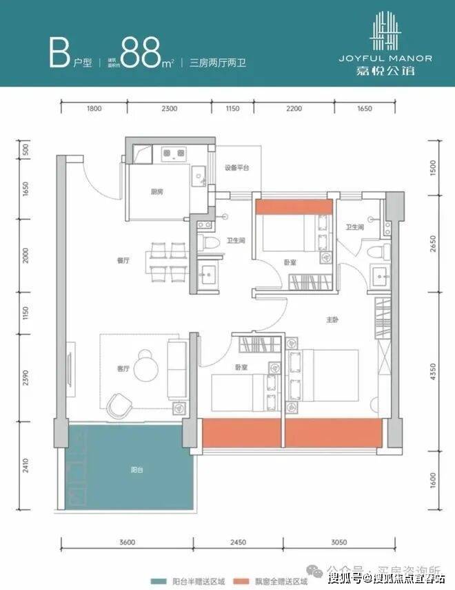 88㎡的3房2厅2卫,设计的是经典竖厅格局,客厅3.6米开间,LDKB一体化设计,三开间朝南,动静分区,3个卧室分别做到了主卧14.26㎡/次卧7.81㎡/次卧5.83㎡(包含墙体飘窗),客厅出8.67㎡的大阳台,U型厨房4.95平,公卫三段式干湿分离,得房率约86-90%(包含赠送),正南朝向。