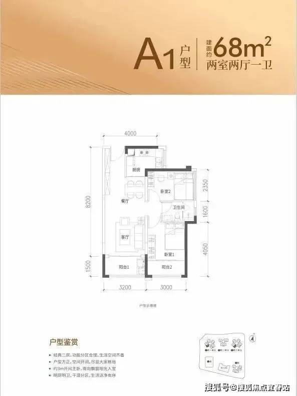 68㎡的2房2厅1卫,设计的是竖厅格局,客厅3.2米开间,进深8.2米,LDKB一体化设计,2个卧室分别做到了主卧12.3㎡/次卧8.46㎡(包含墙体飘窗),U型厨房,卫生间干湿分离,得房率约88%(包含赠送),西南朝向。