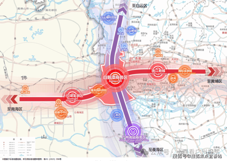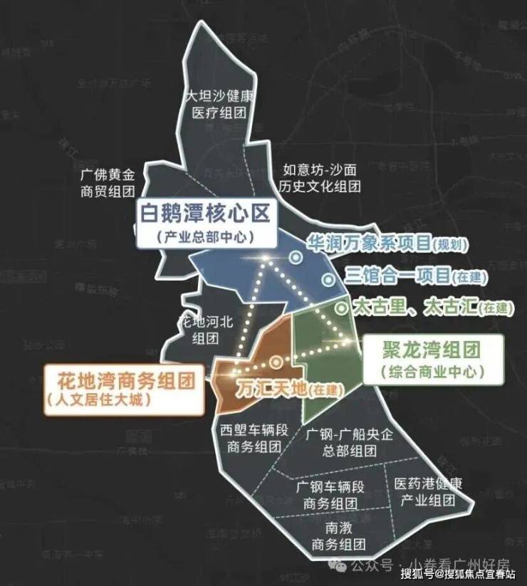 白鹅潭核心区、聚龙组团、花地湾组团,于半径约2KM内构建珠江西岸CAZ黄金三极。