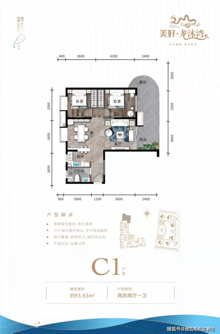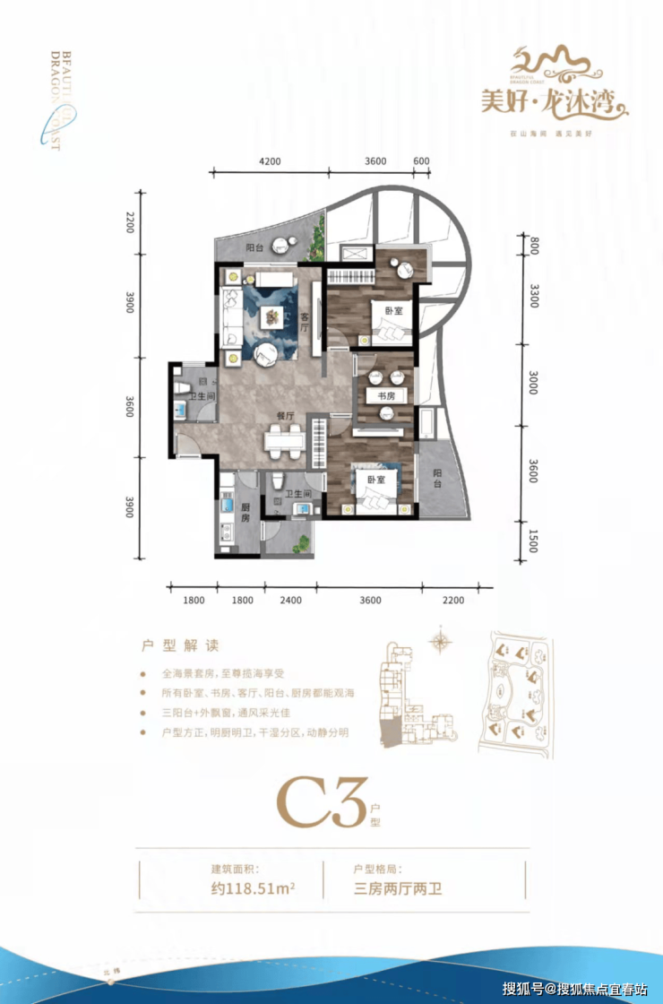 ④ 三房户型三面采光,空间方正合理,双独立明卫,270°环型瞰海阳台