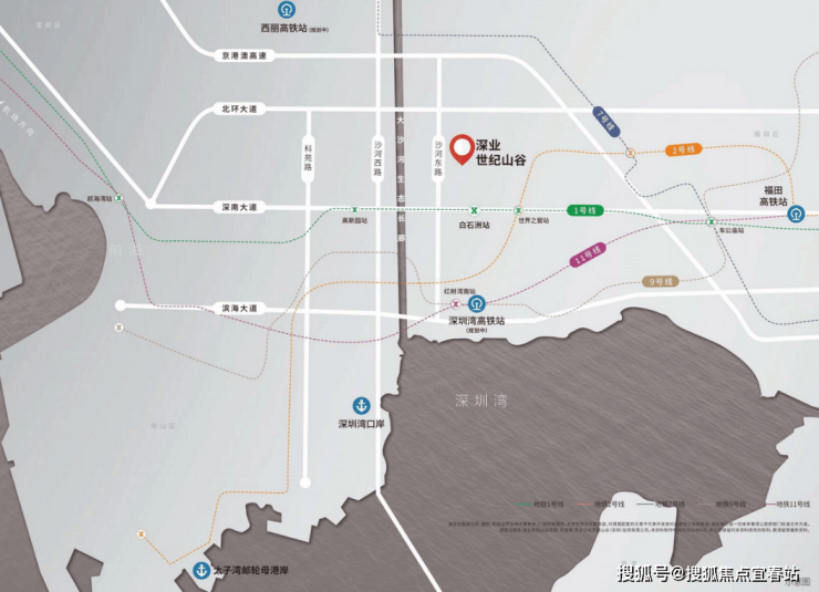 交通:地铁1号线白石洲站(约149米),五轨环绕;快速路网连接京港澳高速、深南大道等主干道