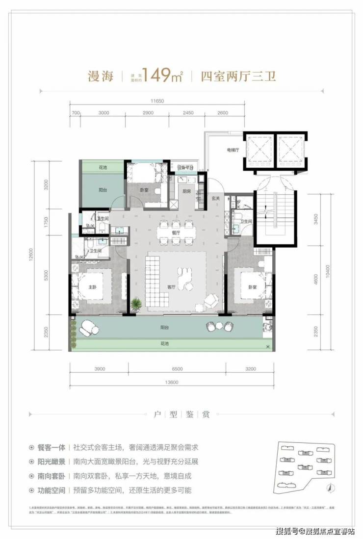 8、部分户型创新设计270°全景飘窗主卧套、四开间朝南等奢阔格局。