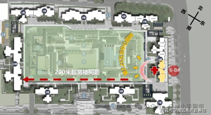 栋间距最大约200米,约等于2.8个国际标准足球场大小;