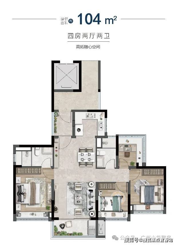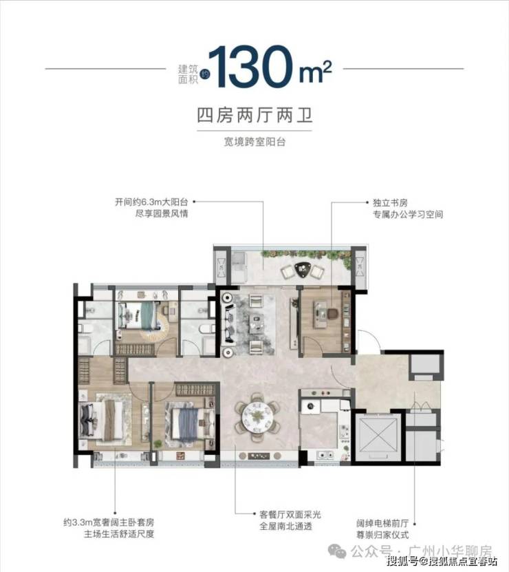 建面约104-168㎡纯改善四房,朝南而居,南北通透,阳光清风常伴,满足品质改善需求。