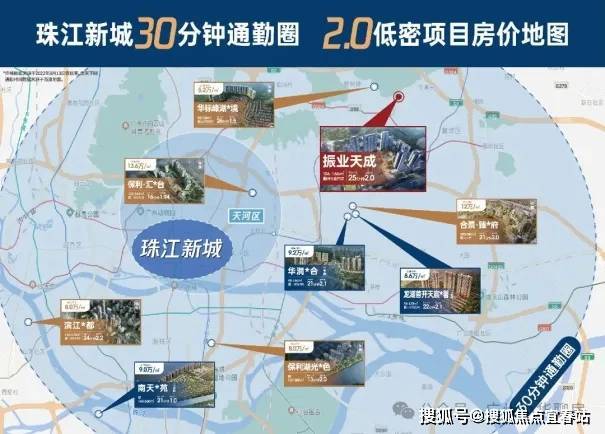 以珠江新城为中心,通勤时长30分钟为半径,振业天成是少有的售价6万/㎡以下的2.0容积率项目,相比之下,其他2.0容积率项目售价都高达8-14万/㎡