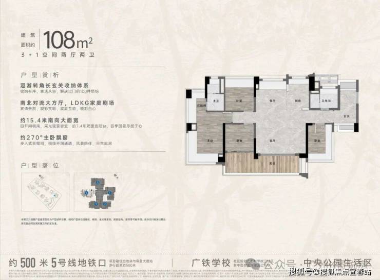 “中央公园”,紧邻大脚印公园,距离地铁约500米,紧邻学校、酒店,户型涵盖75-88㎡三房,105、125、142㎡四房。