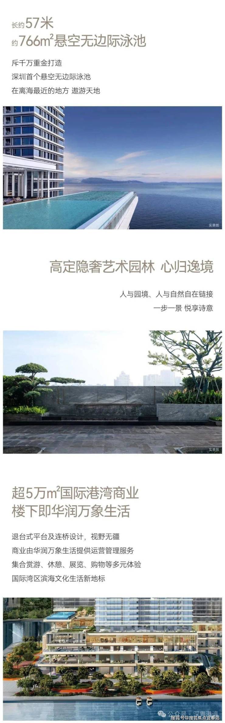 内部配套:配备高端私密会所、约 766 平方米的深圳首个悬空无边际海景泳池、首层城市花园、健身房、儿童游乐区以及 1800 平方米的海洋博物馆等设施。