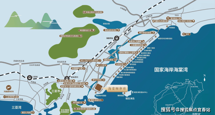 4⃣国家级医疗及健身疗养基地:解放军总医院海南分院(301医院)、国际养生社区、国际康体机构为载体,配合高尔夫、温泉疗养等养生配套设施,形成疗养、休闲、康体一体化的养生湾区