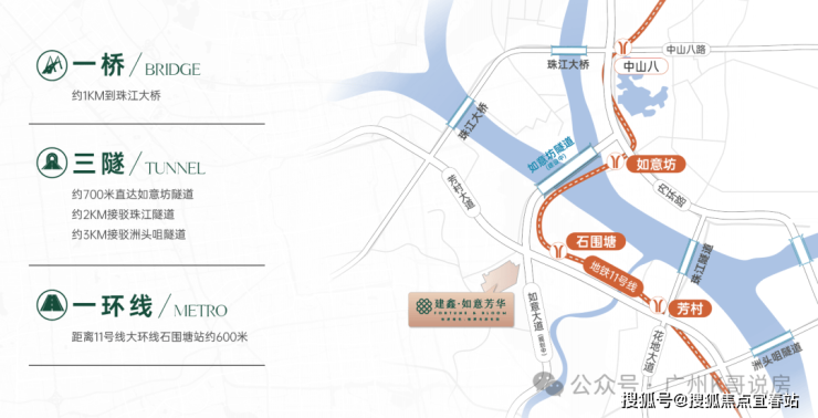 步行约600米可达11号线石围塘站,可便捷换乘多条地铁线路,通达全城。1站如意坊换乘6号线,1站芳村换乘1号线/22号线(建设中)2站中山八换乘5号线,直通珠江新城。