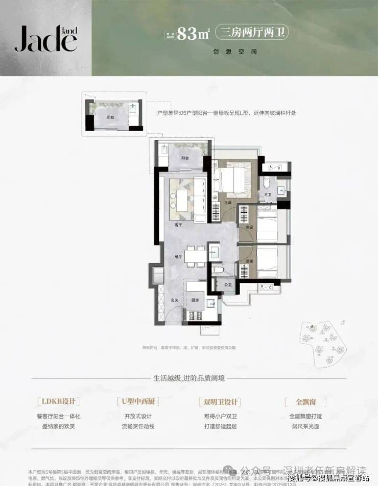 83㎡的3房2厅2卫,设计的是竖厅格局,进门入户玄关,客厅3.2米开间,LDKB一体化,S墙设计预留冰箱卡槽位,U型厨房,主卫少了淋浴,公卫三段式分离,得房率约90.33%(包含赠送),阳台西北朝向。