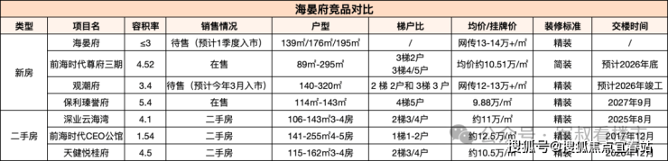 除了观潮府网传价格在12万/㎡以上,其他两盘价格均在10万/㎡左右,而二手房竞品有深业云海湾、前海时代CEO公馆、天健悦桂湾,挂牌价格在10.5-12.5万/㎡之间。