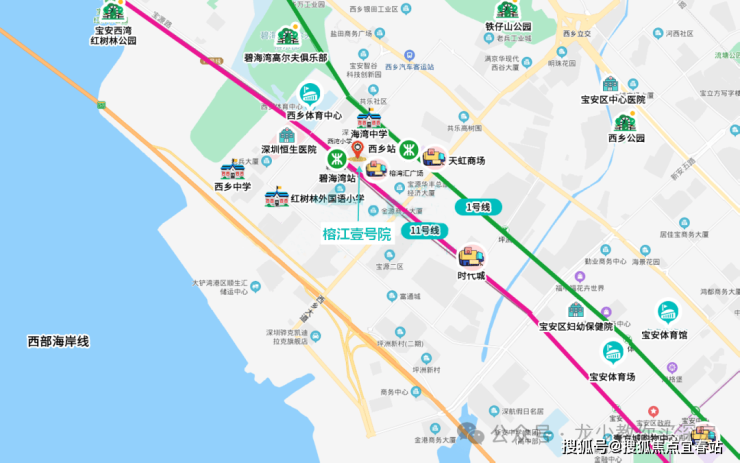 双地铁环绕,11号线碧海湾站地铁口,1号线西乡站500m,交通便利;自带高端集中商业——得丰·榕湾汇商业广场;海湾幼儿园,西湾小学,海湾中学都在家楼下;周边有恒生医院、西乡体育中心,碧海湾公园等,都在800m内。