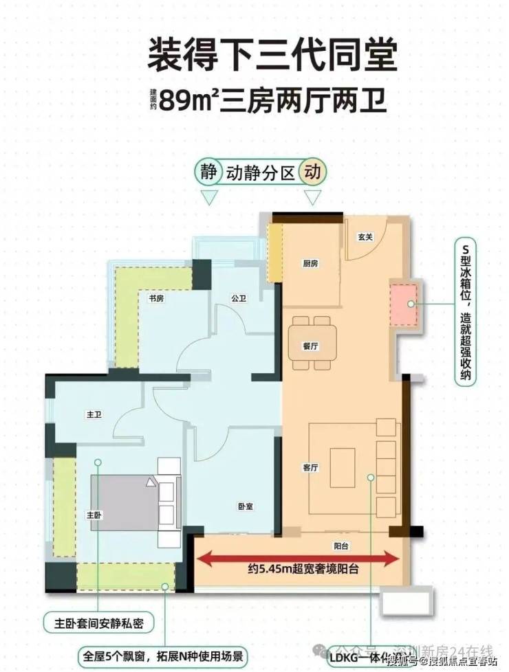 89㎡的3房2厅2卫,02.03户型,设计的是经典竖厅格局,客厅3.4米开间,LDKB一体化,S墙设计预留冰箱卡槽位,动静分区,三开间朝南,3个卧室分别做到了主卧13.79㎡/次卧7.62㎡/次卧6.93㎡(包含墙体飘窗),主卧+1个次卧270°飘窗设计,U型厨房,公卫三段式分离,客厅连接卧室出5.75米长的大阳台,得房率约87.2%(包含赠送),东南朝向。