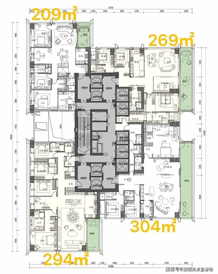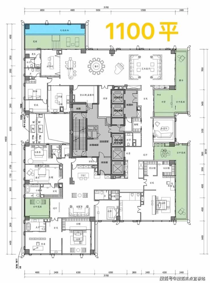 项目首推北区1-2栋共348套房源,户型覆盖209-1100㎡,全部四房三卫起步,彻底告别刚需化设计,保证了圈层的纯粹性。其中,高区58层以上为500-700㎡的顶级大平层,顶楼1100㎡的顶奢大平层仅2套,总价从3000万起,顶楼更是高达4-5亿,单价区间在14-46万/㎡,精准锁定金字塔尖客群。
