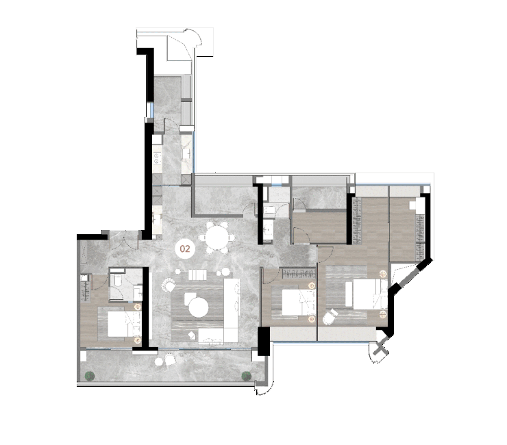 而且客厅拥有270°环江巨幕景观阳台,将江景无缝嵌入室内,获得舒展开阔的景观视野。这个户型是三套房配置,合理布局满足不同家庭成员的生活需求。