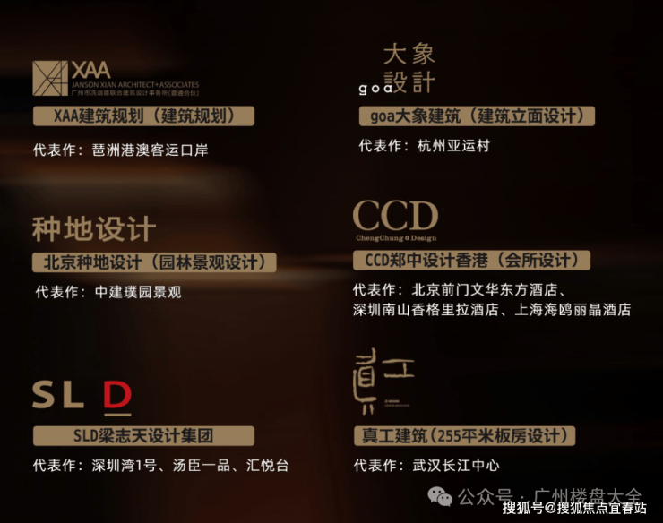 包括广东省勘察设计大师冼剑雄、大象建筑设计总建筑师张晓晓、香港教父级室内设计大师梁志天、香港CCD创始人郑忠、台湾真工建筑创始人程绍正韬和种地设计创始人朱弘博。