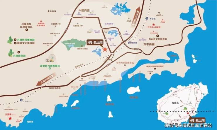 海南万宁 兴隆·依山云锦,十年匠心打磨,坐落于自然与人文和谐交融的兴隆华侨旅游经济区,拥抱山、海、湖、林、溪、岛6大自然稀缺资源:依山而居,享负氧离子浓度高达8万+的天然氧吧;近海而立,咫尺海南‘最美海湾’石梅湾。