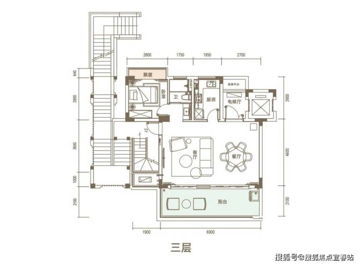 上叠面积134㎡(为3.4层)三房两厅三卫(可实现3➕1房)赠送顶楼露台