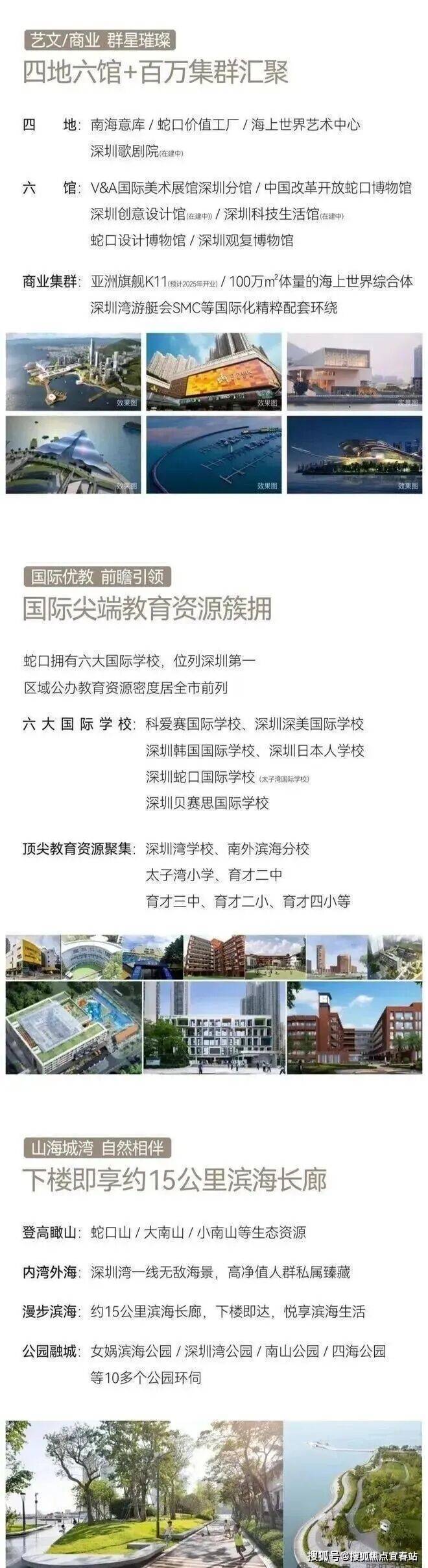 周边配套:滨海长廊,深圳湾公园,2号线东角头站,海上世界和K11等商业配套,南外滨海学校,幼儿园等