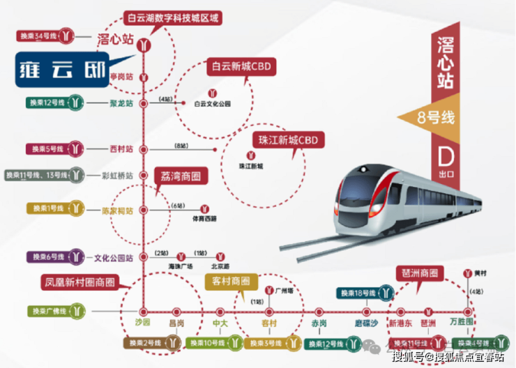 8号线滘心地铁站D出口出来到小区门口实测是650米,该线有8座换乘站,可换乘13条地铁线路,仅需一次换乘,可以轻松到达白云新城、珠江新城、金融城、琶洲等商业中心区。