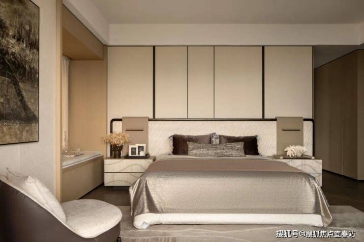 主卧套房以星级标准打造,套房连通独立阳台,直揽一线果岭景观,营造专属私密天地。空间以柔和的米色与深咖啡色调铺陈,在自然光映照下更显层次,营造宁静祥和的休憩氛围。