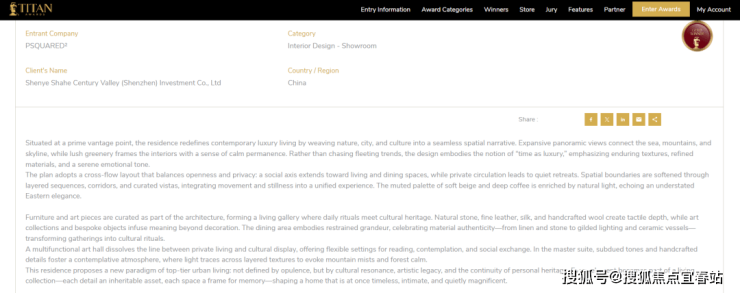 作为全球创意设计领域的标杆性奖项,美国TITAN地产奖,素有“地产界奥斯卡”之称,由国际奖项协会(IAA)主办,以严苛评审体系与高质量标准著称,旨在遴选全球房地产、建筑与室内设计领域的巅峰之作。