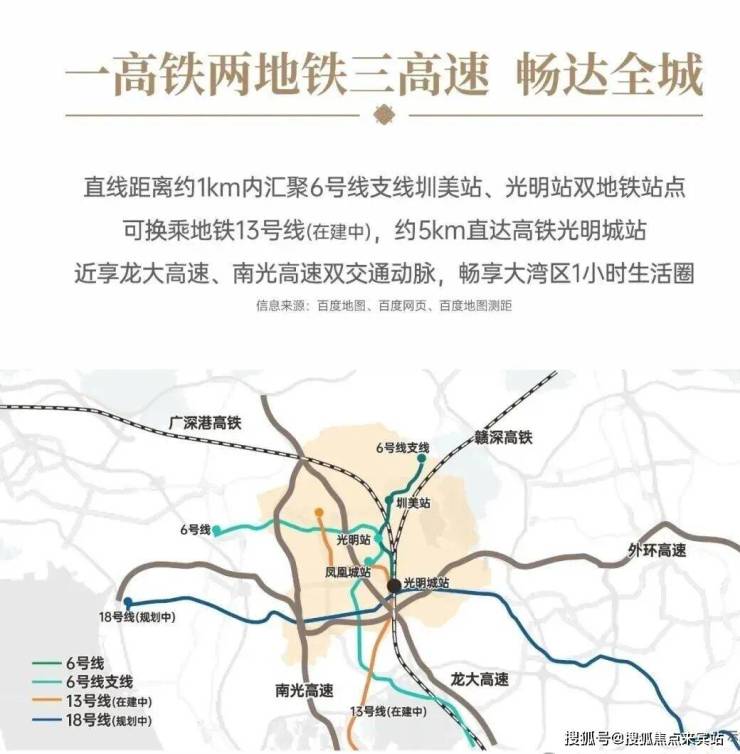 交通配套:项目距离地铁6号支线“圳美站”约900米,6号线光明站距离约1.2公里,3站到凤凰城站可换乘13号地铁线,5站到光明城站,这里可以换乘光明城高铁站,7站到宝安上屋站,12站到南山西丽留仙洞,15站南山高新园,19站到后海。