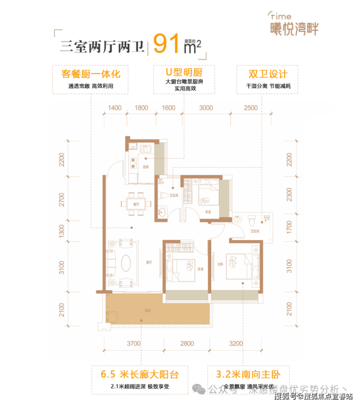 91㎡ 三房两厅两卫 赠送:15㎡