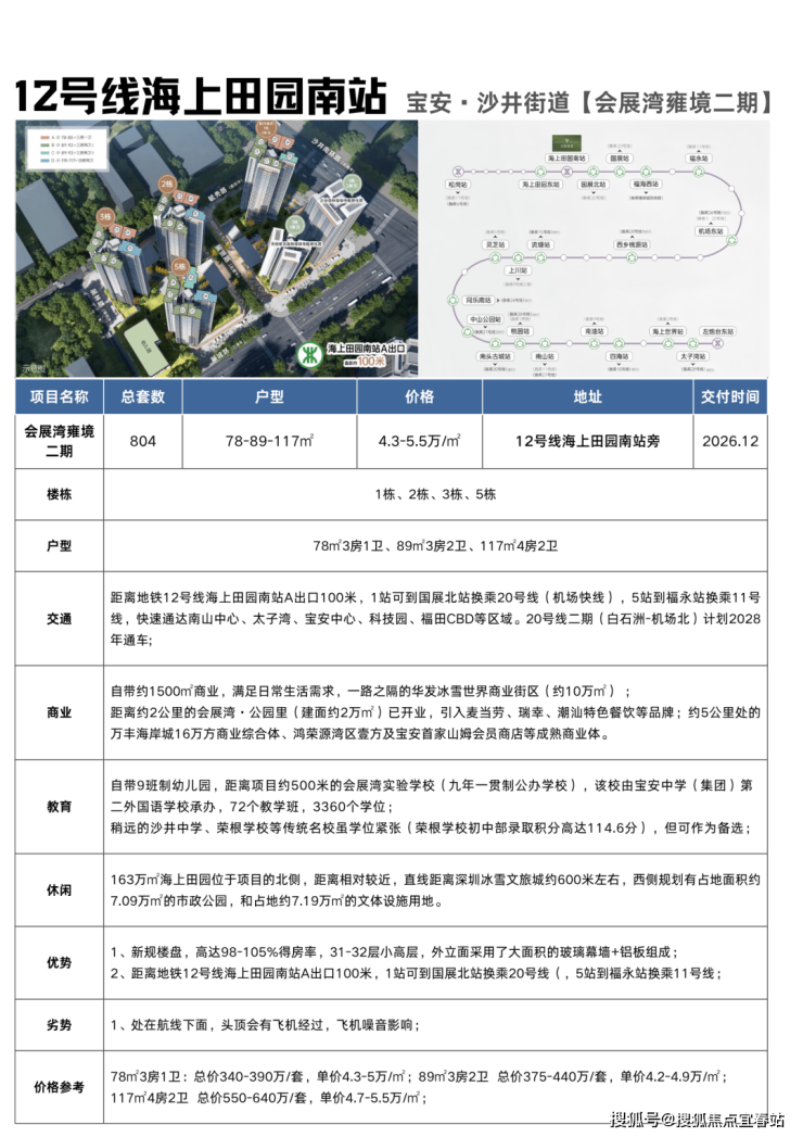 <交通>:快速通达南山中心、太子湾、宝安中心、科技园、福田CBD等区域。20号线二期(白石洲-机场北)计划2028年通车;