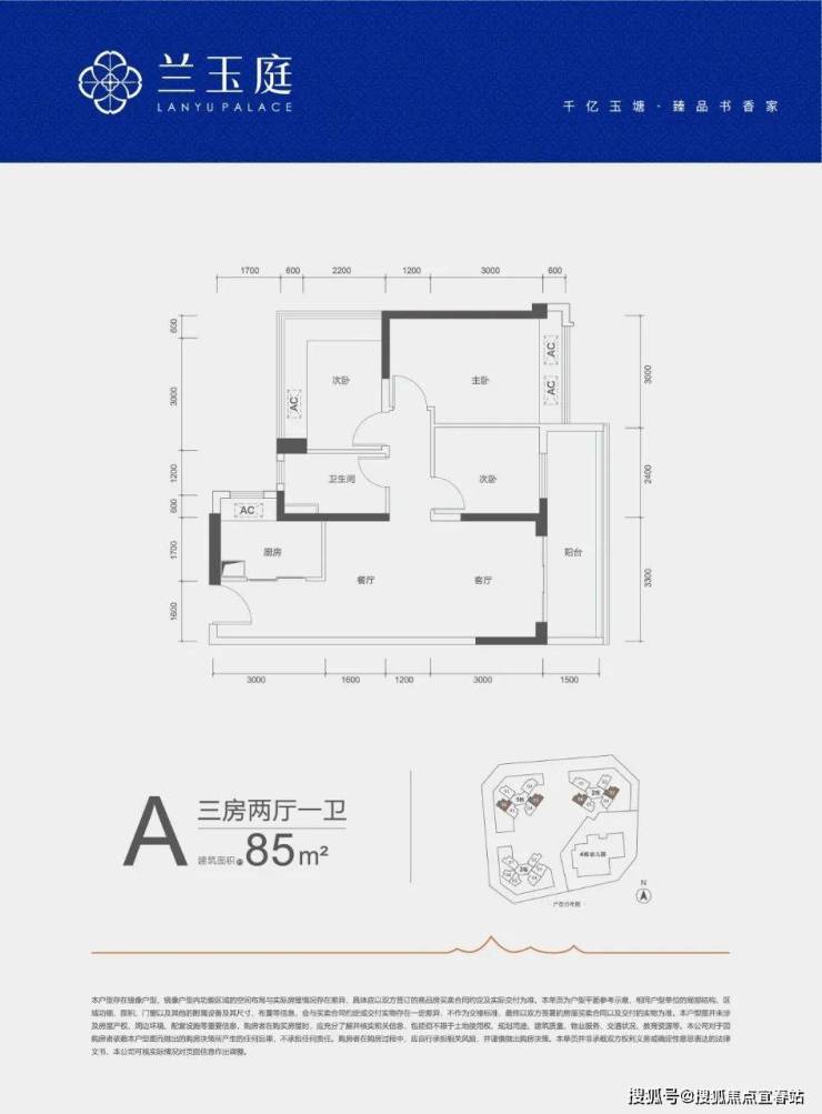 85㎡的3房2厅1卫,A户型,设计的是竖厅格局,客厅开间3.3米,LDKB一体化,三开间朝南,3个卧室分别做到了3米/2.8米/2.4米的宽度,客厅连接次卧出5.7米长的大阳台,L型厨房,得房率约79%(不含赠送),西南或东南经向。