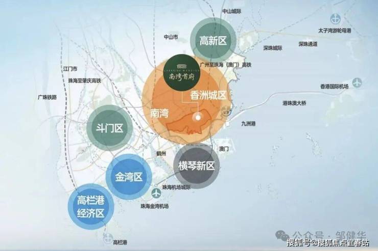 南湾位居珠海地理几何中心,东面一桥之隔即为香洲老城区,南面与横琴粤澳深度合作区、十字门中央商务区一山之隔;西面规划鹤州新中心;