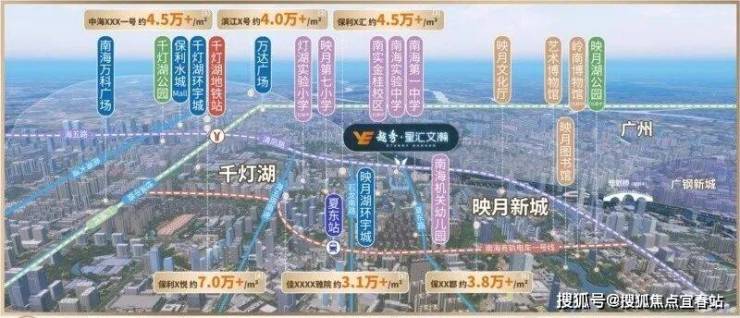越秀星汇文瀚所在的南海平洲板块,属于千灯湖金融高新区C区外溢区域,同时也是映月新城的核心辐射范围。近年来,平洲板块的发展定位逐渐清晰,一方面承接千灯湖的产业和人口外溢,另一方面依托映月新城2000亿投资,打造中央人文区,未来潜力不容小觑。