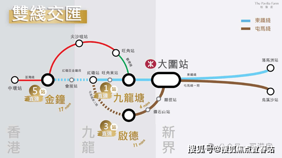 『柏傲庄』傲踞港铁大围站上盖,东铁线及屯马线的汇聚点,连上「四隧」-尖山隧道、城门隧道、塞拉利昂隧道及大老山隧道,转眼直达九龙东及中环两大核心商业区。