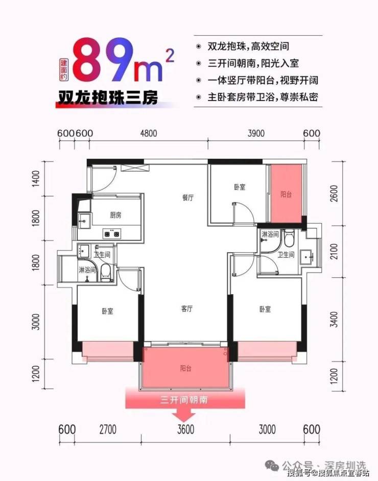 2、户型:建筑面积约89㎡三房两厅两卫,东南朝向,双阳台,主卧套房设计