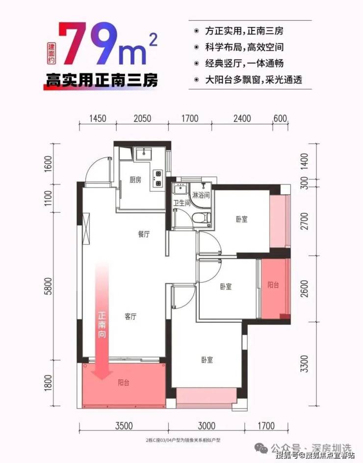 1、户型:建筑面积约78-79㎡极致三房两厅一卫,稀缺高性价比三房