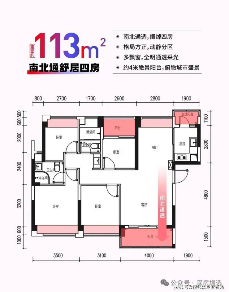 3、户型:建筑面积约113-120㎡四房两厅两卫,稀缺南北通透,三阳台设计,约4米阔景大阳台