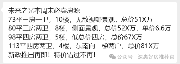 目前万科未来之光,推出特价房远,总价500多个,就可以上车精装小高层三房,国庆钜惠,数量可是有限的哟!