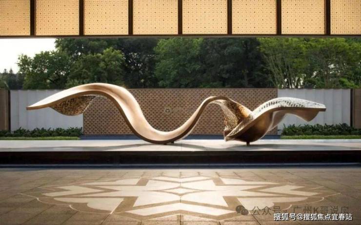 由广东非遗剪纸大师饶宝莲亲手打造的“勇立潮头舟”跃然眼前。整个作品采用铜凿剪纸和金漆木雕结合的工艺,镂空雕刻了羊城八景的纹样。在庭院水景的映衬下,犹如龙舟竞渡,生生不息,寄寓着天曜业主抢占先机,敢为人先的进取精神。