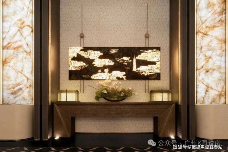 透过中空挂落,日光倾泻而入下方的“金石浮光”的艺术雕塑,阳光与金石肌理交织出细腻的纹理,低调奢华的氛围扑面而来。